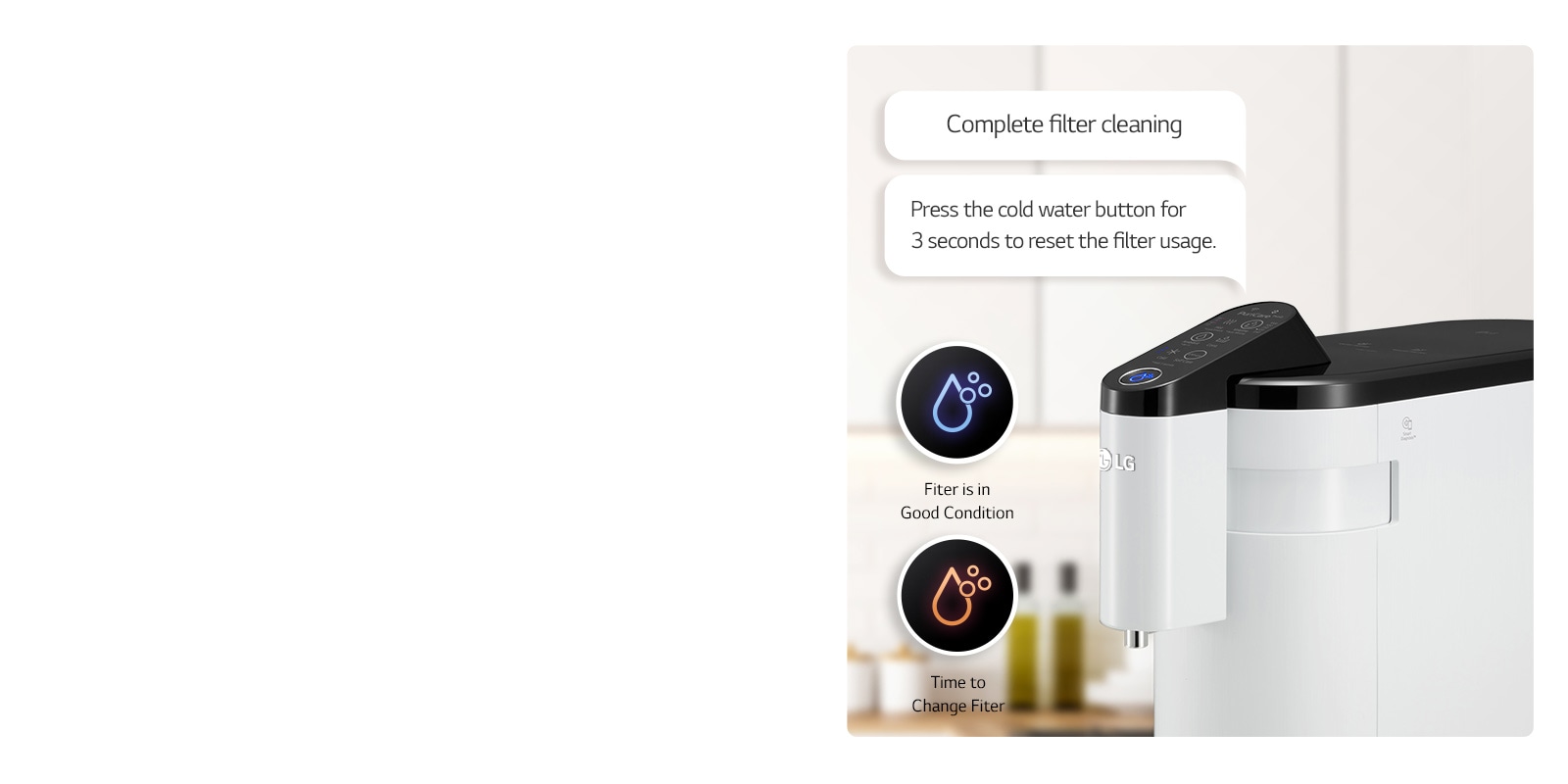 *Norovirus 99.99% removal is the test result measured under the limited conditions of Norogen (20.6) based on the LG’s internal evaluation method. And there may be differences depending on the operating environment. (When 3,600L was passed through the filter at a flow rate of 2.0LPM, 0.6L of norovirus with a concentration of 1.0×10^4PFU/ml or higher was passed at a flow rate of 1.0LPM, and the amount of norovirus in the water that passed through was measured)